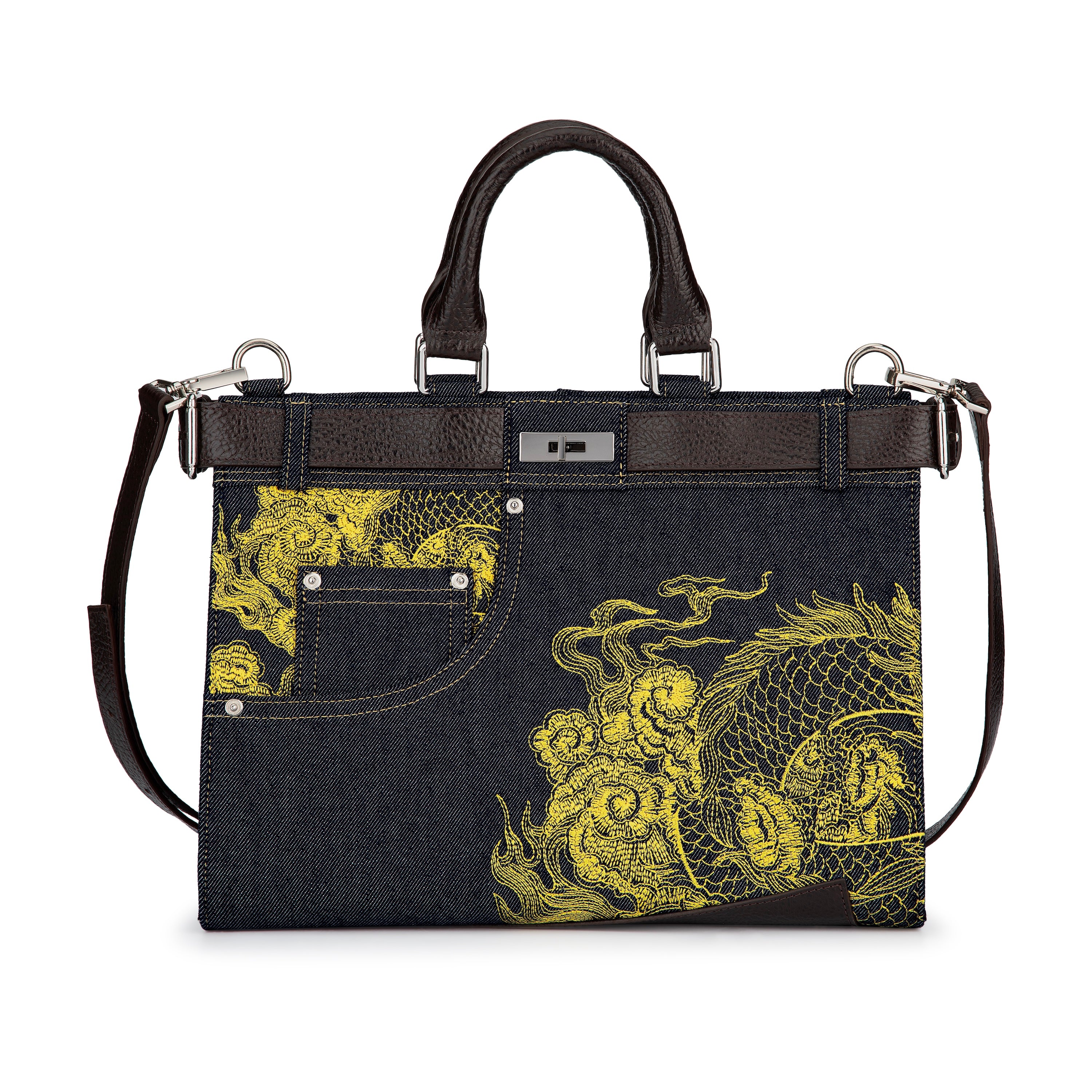 indigo raw denim / genuine leather handle and adjustable leather strap / genuine leather belt detail is functional and can be opened at both ends / with turn-lock closure / denim pocket details on front and back / embroidery on front and back / two inner compartments divided by a zip pocket / with inner pocket with zip